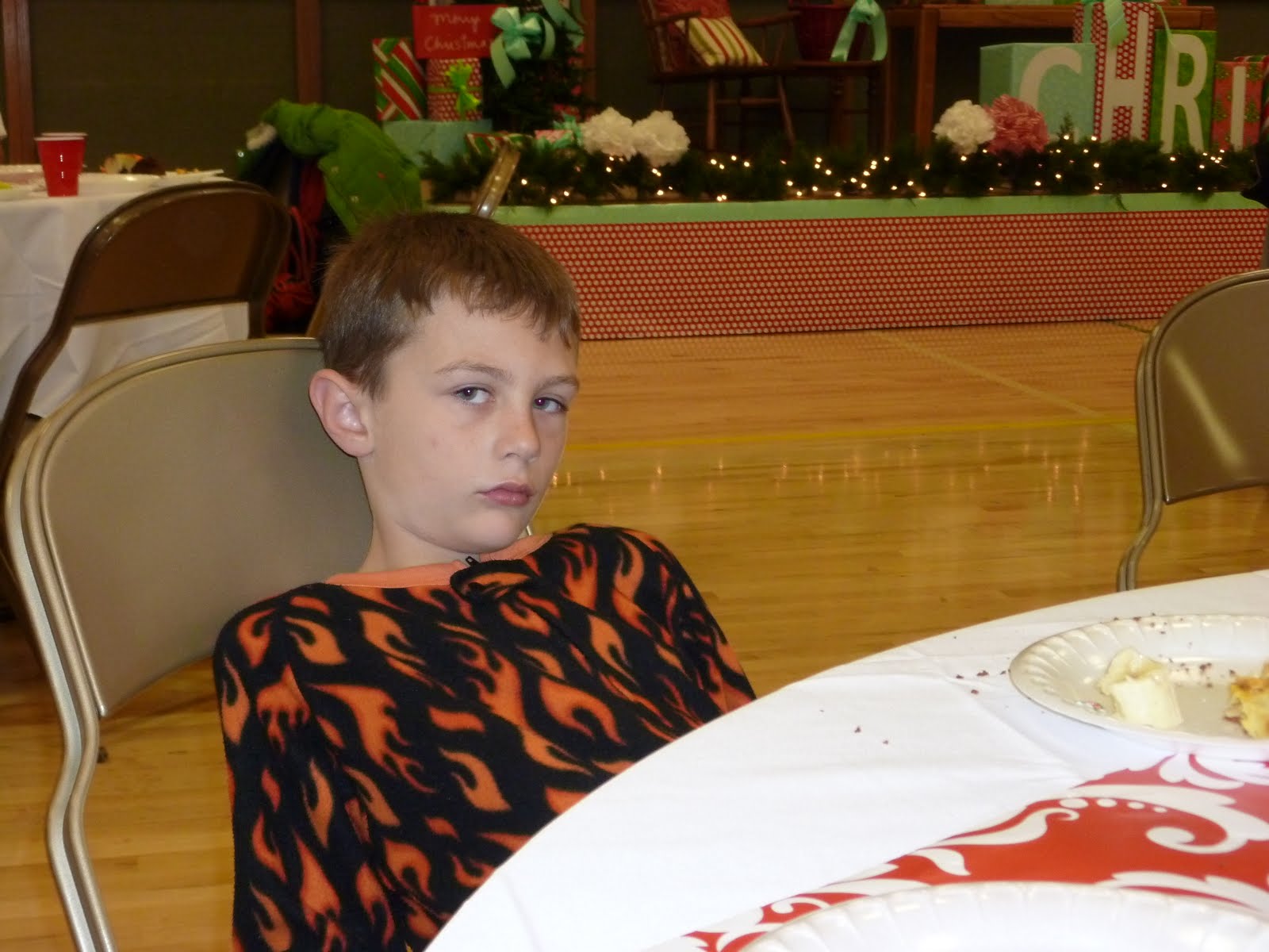 We had our annual breakfast with Santa in our pj's on Saturday. The food was really yummy and the program was great. Braden seems grumpy here because he wasn't allowed to leave his chair. Something about running wild in the hallways of the church...